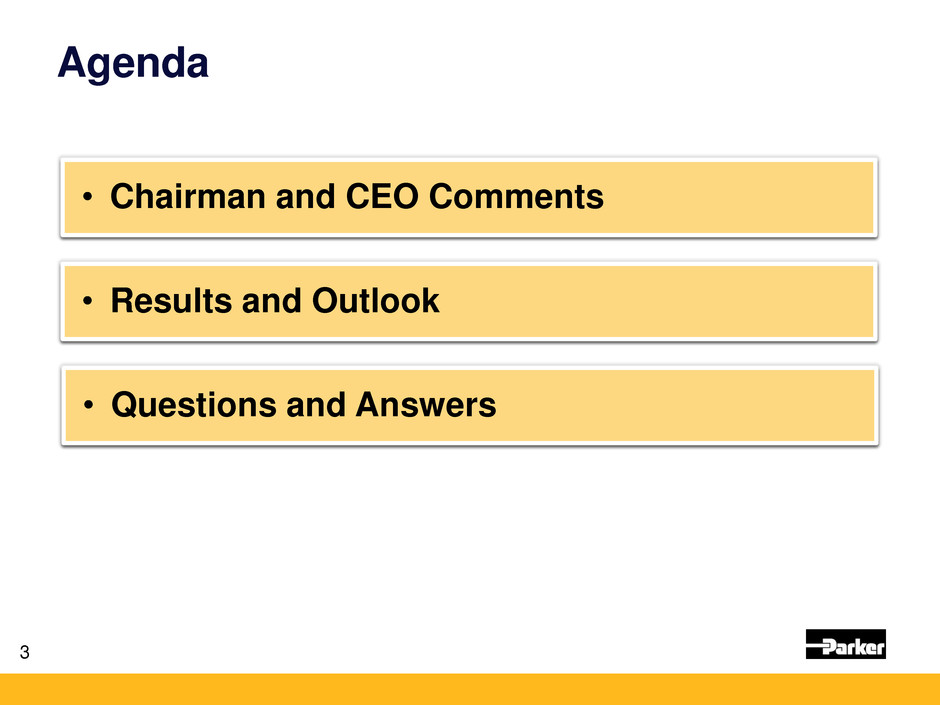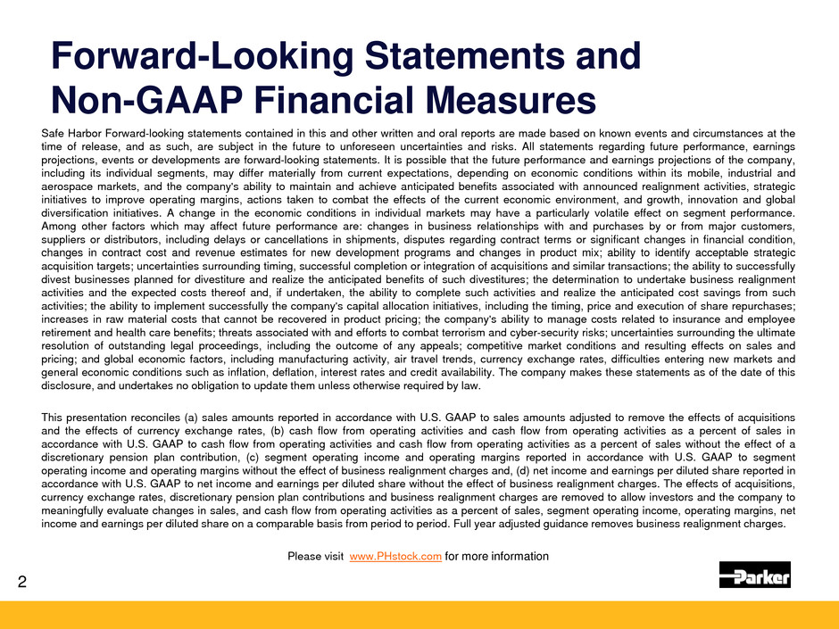 Forward-Looking Statements and Non-GAAP Financial Measures Safe Harbor Forward-looking statements contained in this and other written and oral reports are made based on known events and circumstances at the time of release, and as such, are subject in the future to unforeseen uncertainties and risks. All statements regarding future performance, earnings projections, events or developments are forward-looking statements. It is possible that the future performance and earnings projections of the company, including its individual segments, may differ materially from current expectations, depending on economic conditions within its mobile, industrial and aerospace markets, and the company's ability to maintain and achieve anticipated benefits associated with announced realignment activities, strategic initiatives to improve operating margins, actions taken to combat the effects of the current economic environment, and growth, innovation and global diversification initiatives. A change in the economic conditions in individual markets may have a particularly volatile effect on segment performance. Among other factors which may affect future performance are: changes in business relationships with and purchases by or from major customers, suppliers or distributors, including delays or cancellations in shipments, disputes regarding contract terms or significant changes in financial condition, changes in contract cost and revenue estimates for new development programs and changes in product mix; ability to identify acceptable strategic acquisition targets; uncertainties surrounding timing, successful completion or integration of acquisitions and similar transactions; the ability to successfully divest businesses planned for divestiture and realize the anticipated benefits of such divestitures; the determination to undertake business realignment activities and the expected costs thereof and, if undertaken, the ability to complete such activities and realize the anticipated cost savings from such activities; the ability to implement successfully the company's capital allocation initiatives, including the timing, price and execution of share repurchases; increases in raw material costs that cannot be recovered in product pricing; the company's ability to manage costs related to insurance and employee retirement and health care benefits; threats associated with and efforts to combat terrorism and cyber-security risks; uncertainties surrounding the ultimate resolution of outstanding legal proceedings, including the outcome of any appeals; competitive market conditions and resulting effects on sales and pricing; and global economic factors, including manufacturing activity, air travel trends, currency exchange rates, difficulties entering new markets and general economic conditions such as inflation, deflation, interest rates and credit availability. The company makes these statements as of the date of this disclosure, and undertakes no obligation to update them unless otherwise required by law. This presentation reconciles (a) sales amounts reported in accordance with U.S. GAAP to sales amounts adjusted to remove the effects of acquisitions and the effects of currency exchange rates, (b) cash flow from operating activities and cash flow from operating activities as a percent of sales in accordance with U.S. GAAP to cash flow from operating activities and cash flow from operating activities as a percent of sales without the effect of a discretionary pension plan contribution, (c) segment operating income and operating margins reported in accordance with U.S. GAAP to segment operating income and operating margins without the effect of business realignment charges and, (d) net income and earnings per diluted share reported in accordance with U.S. GAAP to net income and earnings per diluted share without the effect of business realignment charges. The effects of acquisitions, currency exchange rates, discretionary pension plan contributions and business realignment charges are removed to allow investors and the company to meaningfully evaluate changes in sales, and cash flow from operating activities as a percent of sales, segment operating income, operating margins, net income and earnings per diluted share on a comparable basis from period to period. Full year adjusted guidance removes business realignment charges. Please visit www.PHstock.com for more information 2