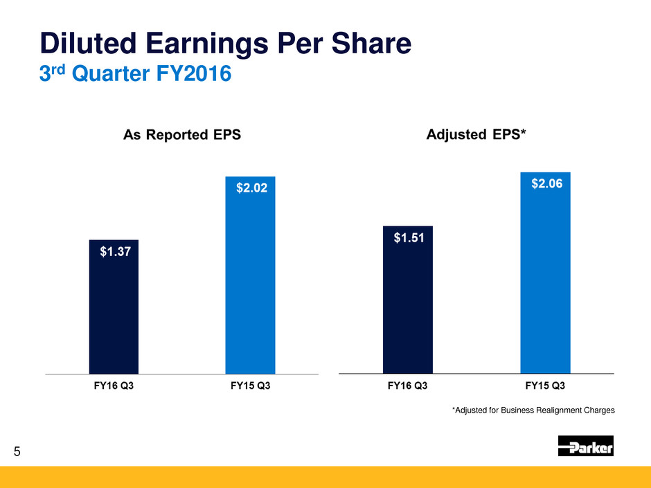 4 3rd Quarter FY2016 Highlights Strong Performance in a Challenging Environment Third Quarter Sales of $2.8B Declined 10.6% (1.5% Currency, 9.4% Organic) Adjusted Earnings per Share of $1.51 ($1.37 As Reported) YTD Operating Cash Flow 10.5% of Sales Adjusted (8.1% As Reported) Impressive Margin Performance Moderating Rate of Decline in Orders Increasing Adjusted Guidance by $.20 at the Midpoint Meaningful Progress with Execution of the New Win Strategy