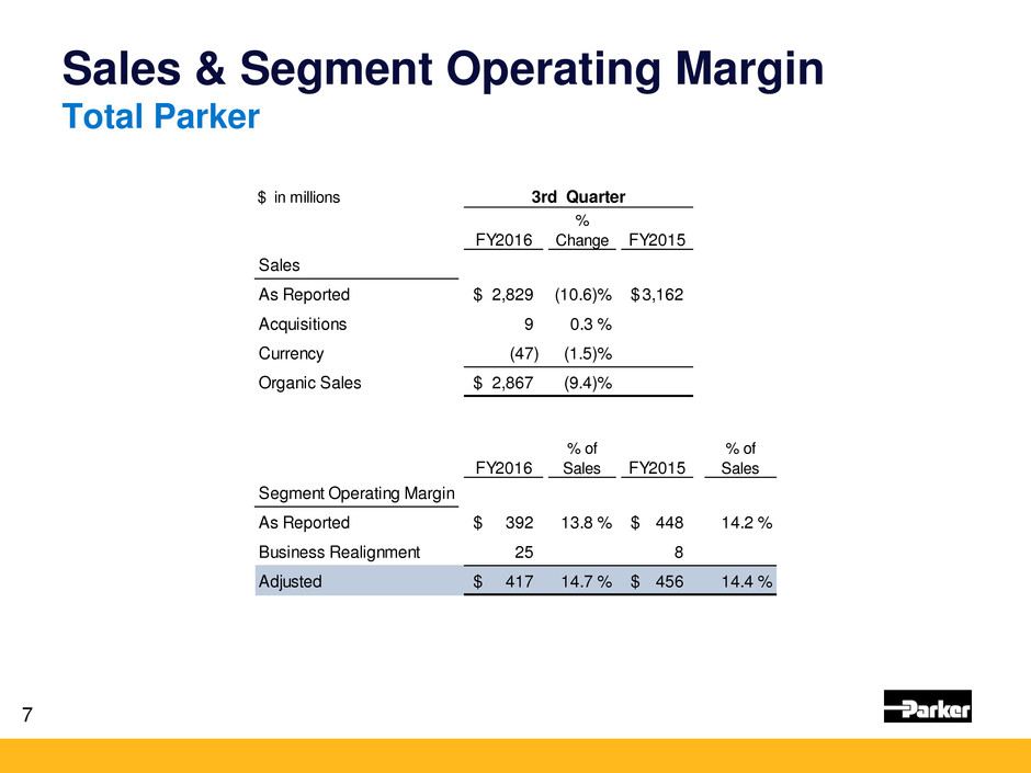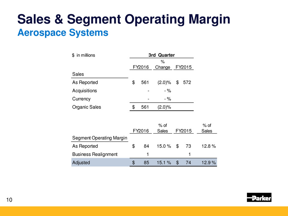 $ in millions 3rd Quarter FY2016 % Change FY2015 Sales As Reported 561$ (2.0)% 572$ Acquisitions - - % Currency - - % Organic Sales 561$ (2.0)% FY2016 % of Sales FY2015 % of Sales Segment Operating Margin As Reported 84$ 15.0 % 73$ 12.8 % Business Realignment 1 1 Adjusted 85$ 15.1 % 74$ 12.9 % Sales & Segment Operating Margin Aerospace Systems 10
