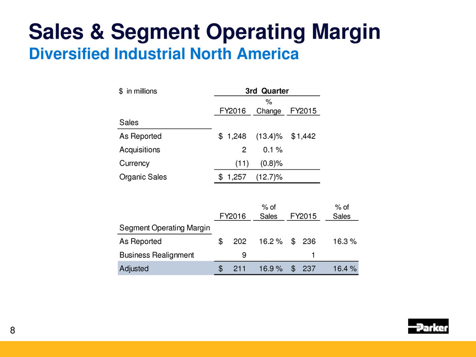 Sales & Segment Operating Margin Total Parker 7 $ in millions 3rd Quarter FY2016 % Change FY2015 Sales As Reported 2,829$ (10.6)% 3,162$ Acquisitions 9 0.3 % Currency (47) (1.5)% Organic Sales 2,867$ (9.4)% FY2016 % of Sales FY2015 % of Sales Segment Operating Margin As Reported 392$ 13.8 % 448$ 14.2 % Business Realignment 25 8 Adjusted 417$ 14.7 % 456$ 14.4 %