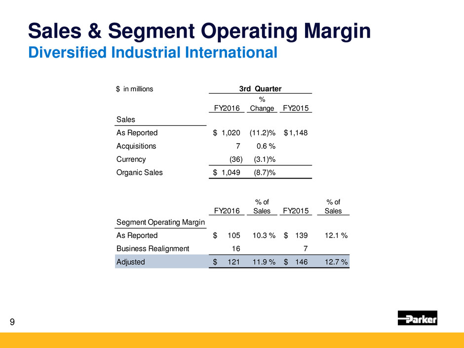 $ in millions 3rd Quarter FY2016 % Change FY2015 Sales As Reported 1,020$ (11.2)% 1,148$ Acquisitions 7 0.6 % Currency (36) (3.1)% Organic Sales 1,049$ (8.7)% FY2016 % of Sales FY2015 % of Sales Segment Operating Margin As Reported 105$ 10.3 % 139$ 12.1 % Business Realignment 16 7 Adjusted 121$ 11.9 % 146$ 12.7 % Sales & Segment Operating Margin Diversified Industrial International 9