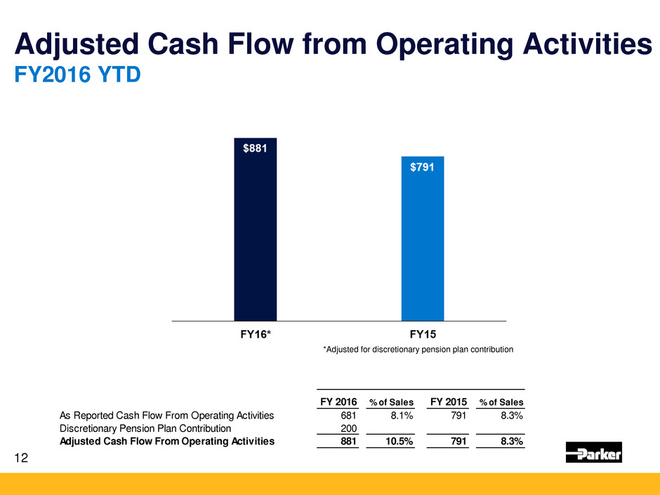 Mar 2016 Dec 2015 Mar 2015 Dec 2014 Total Parker 6 %- 12 %- 4 %- 4 %+ Diversified Industrial North America 9 %- 15 %- 6 %- 4 %+ Diversified Industrial International 6 %- 10 %- 3 %- 1 %+ Aerospace Systems 1 %+ 11 %- 3 %- 9 %+ Order Rates 11 Excludes Acquisitions, Divestitures & Currency 3-month year-over-year comparisons of total dollars, except Aerospace Systems Aerospace Systems is calculated using a 12-month rolling average