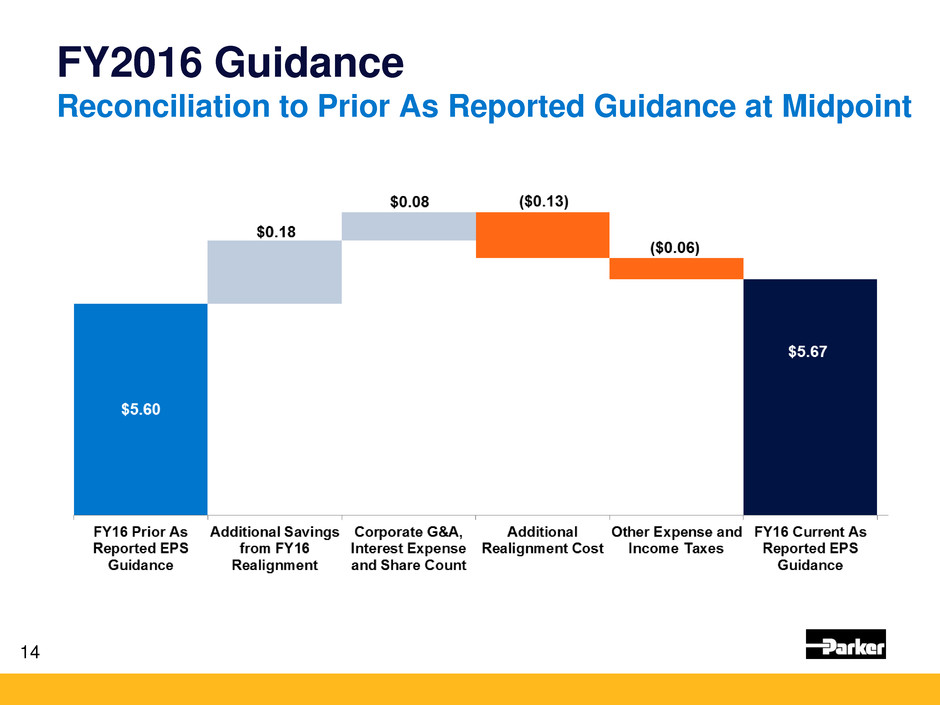 Sales Growth vs. Prior Year Diversified Industrial North America (14.5%) - (12.5%) Diversified Industrial International (14.2%) - (12.2%) Aerospace Systems (0.4%) - 1.2% Total Parker (11.9%) - (9.9%) Adjusted Segment Operating Margins Diversified Industrial North America 16.7% - 16.9% Diversified Industrial International 12.3% - 12.5% Aerospace Systems 14.8% - 15.0% Total Parker 14.7% - 14.9% Below the Line Items Corporate General & Administrative Expense, Interest and Other $478 M Tax Rate Full Year 28% Shares Diluted Shares Outstanding (Full Year Average) 137M Earnings Per Share As Reported Range $5.57 - $5.77 Adjusted Range $6.20 - $6.40 FY2016 Guidance Adjusted EPS increased to $6.30 Midpoint 13 FY16 Adjusted Segment Operating Margins exclude FY16 Business Realignment Charges FY16 Adjusted Earnings Per Share excludes FY16 Business Realignment Charges