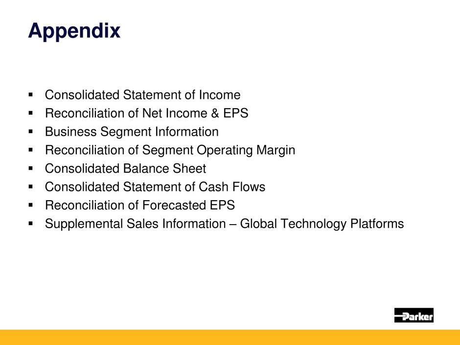 Appendix Consolidated Statement of Income Reconciliation of Net Income & EPS Business Segment Information Reconciliation of Segment Operating Margin Consolidated Balance Sheet Consolidated Statement of Cash Flows Reconciliation of Forecasted EPS Supplemental Sales Information – Global Technology Platforms