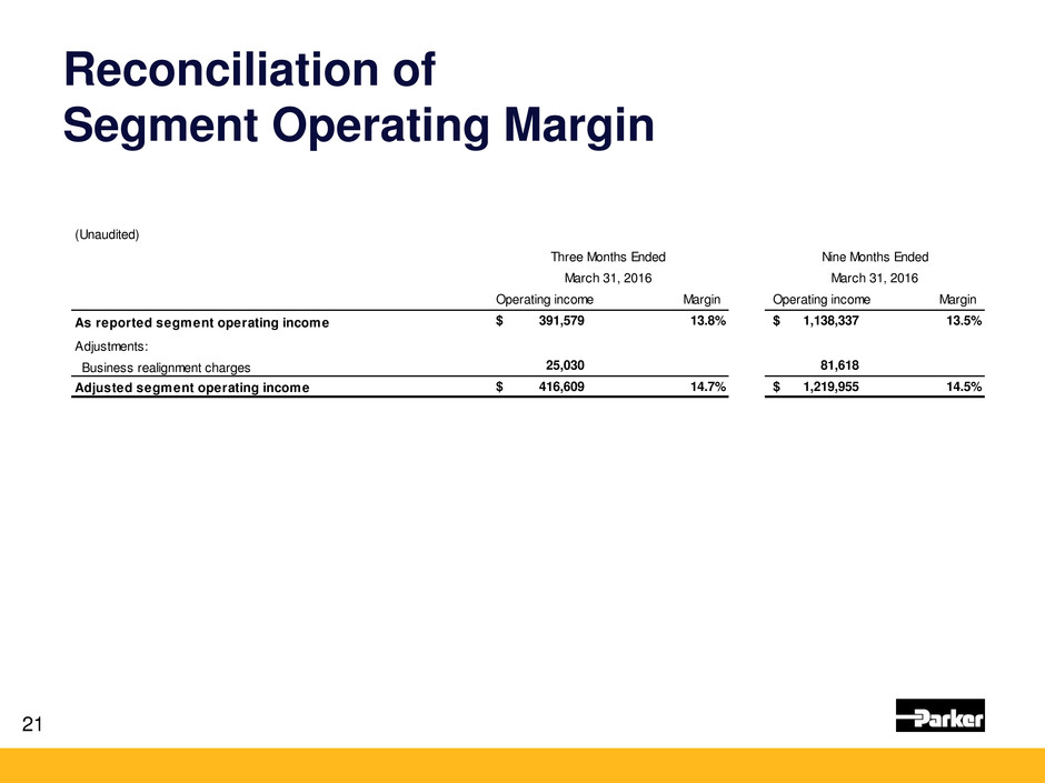 Business Segment Information By Industry 20 (Unaudited) Three Months Ended March 31, Nine Months Ended March 31, (Dollars in thousands) 2016 2015 2016 2015 Net sales Diversif ied Industrial: North America 1,247,904$ 1,441,625$ 3,695,008$ 4,302,644$ International 1,019,776 1,148,248 3,050,687 3,599,145 Aerospace Systems 560,985 572,438 1,657,908 1,665,447 Total 2,828,665$ 3,162,311$ 8,403,603$ 9,567,236$ Segment operating income Diversif ied Industrial: North America 202,180$ 235,516$ 568,509$ 726,640$ International 105,161 139,473 329,823 465,803 Aerospace Systems 84,238 73,334 240,005 205,500 Total segment operating income 391,579 448,323 1,138,337 1,397,943 Corporate general and administrative expenses 42,322 45,515 126,583 152,319 Income before interest and other 349,257 402,808 1,011,754 1,245,624 Interest expense 33,745 35,003 103,802 83,609 Other expense (income) 42,519 (20,561) 129,430 33,748 Income before income taxes 272,993$ 388,366$ 778,522$ 1,128,267$