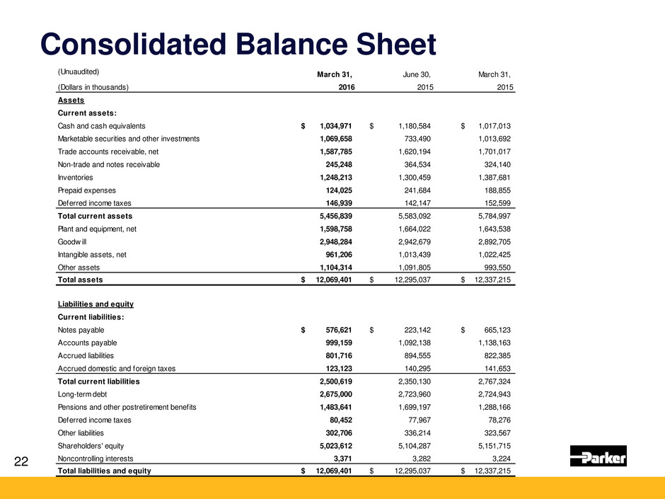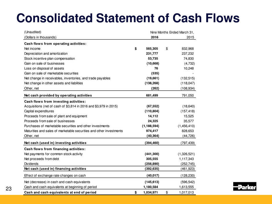 Consolidated Balance Sheet 22 (Unuaudited) March 31, June 30, March 31, (Dollars in thousands) 2016 2015 2015 Assets Current assets: Cash and cash equivalents 1,034,971$ 1,180,584$ 1,017,013$ Marketable securities and other investments 1,069,658 733,490 1,013,692 Trade accounts receivable, net 1,587,785 1,620,194 1,701,017 Non-trade and notes receivable 245,248 364,534 324,140 Inventories 1,248,213 1,300,459 1,387,681 Prepaid expenses 124,025 241,684 188,855 Deferred income taxes 146,939 142,147 152,599 Total current assets 5,456,839 5,583,092 5,784,997 Plant and equipment, net 1,598,758 1,664,022 1,643,538 Goodw ill 2,948,284 2,942,679 2,892,705 Intangible assets, net 961,206 1,013,439 1,022,425 Other assets 1,104,314 1,091,805 993,550 Total assets 12,069,401$ 12,295,037$ 12,337,215$ Liabilities and equity Current liabilities: Notes payable 576,621$ 223,142$ 665,123$ Accounts payable 999,159 1,092,138 1,138,163 Accrued liabilities 801,716 894,555 822,385 Accrued domestic and foreign taxes 123,123 140,295 141,653 Total current liabilities 2,500,619 2,350,130 2,767,324 Long-term debt 2,675,000 2,723,960 2,724,943 Pensions and o her postretirement benefits 1,483,641 1,699,197 1,288,166 Deferred income taxes 80,452 77,967 78,276 Other liabilities 302,706 336,214 323,567 Shareholders' equity 5,023,612 5,104,287 5,151,715 Noncontrolling interests 3,371 3,282 3,224 Total liabilities and equity 12,069,401$ 12,295,037$ 12,337,215$