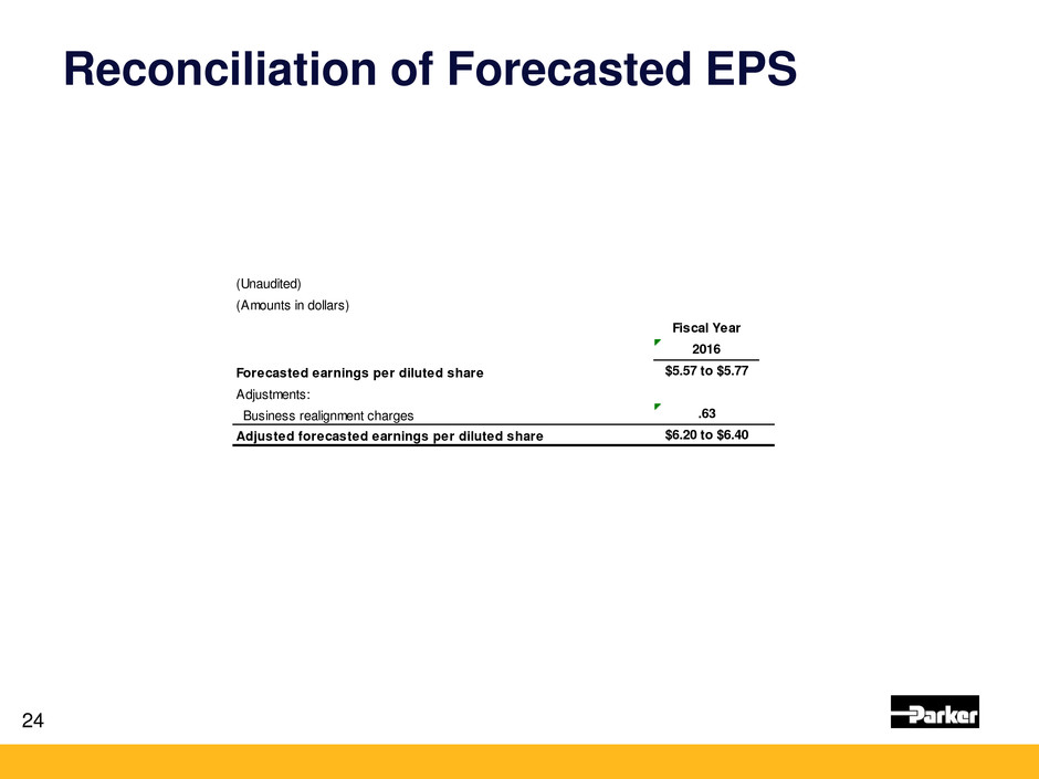 (Unaudited) (Amounts in dollars) Fiscal Year 2016 Forecasted earnings per diluted share $5.57 to $5.77 Adjustments: Business realignment charges .63 Adjusted forecasted earnings per diluted share $6.20 to $6.40 Reconciliation of Forecasted EPS 24