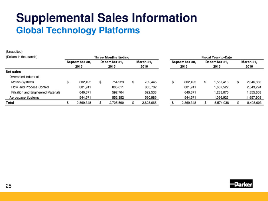 Supplemental Sales Information Global Technology Platforms 25 (Unaudited) (Dollars in thousands) September 30, 2015 December 31, 2015 March 31, 2016 September 30, 2015 December 31, 2015 March 31, 2016 Net sales Diversif ied Industrial: Motion Systems 802,495$ 754,923$ 789,445$ 802,495$ $ 1,557,418 $ 2,346,863 Flow and Process Control 881,911 805,611 855,702 881,911 1,687,522 2,543,224 Filtration and Engineered Materials 640,371 592,704 622,533 640,371 1,233,075 1,855,608 Aerospace Systems 544,571 552,352 560,985 544,571 1,096,923 1,657,908 Total 2,869,348$ 2,705,590$ 2,828,665$ 2,869,348$ 5,574,938$ 8,403,603$ Fiscal Year-to-DateThree Months Ending