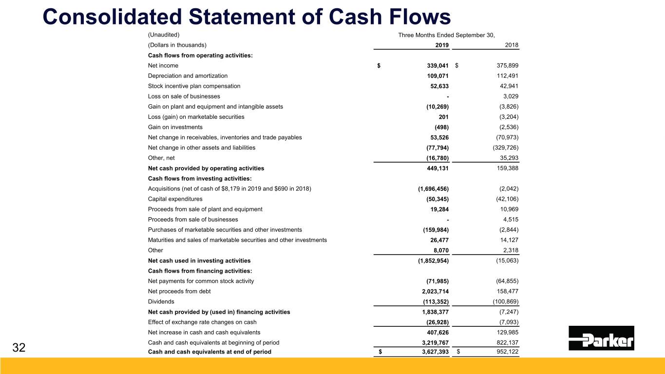 Consolidated Statement of Cash Flows (Unaudited) Three Months Ended September 30, (Dollars in thousands) 2019 2018 Cash flows from operating activities: Net income $ 339,041 $ 375,899 Depreciation and amortization 109,071 112,491 Stock incentive plan compensation 52,633 42,941 Loss on sale of businesses - 3,029 Gain on plant and equipment and intangible assets (10,269) (3,826) Loss (gain) on marketable securities 201 (3,204) Gain on investments (498) (2,536) Net change in receivables, inventories and trade payables 53,526 (70,973) Net change in other assets and liabilities (77,794) (329,726) Other, net (16,780) 35,293 Net cash provided by operating activities 449,131 159,388 Cash flows from investing activities: Acquisitions (net of cash of $8,179 in 2019 and $690 in 2018) (1,696,456) (2,042) Capital expenditures (50,345) (42,106) Proceeds from sale of plant and equipment 19,284 10,969 Proceeds from sale of businesses - 4,515 Purchases of marketable securities and other investments (159,984) (2,844) Maturities and sales of marketable securities and other investments 26,477 14,127 Other 8,070 2,318 Net cash used in investing activities (1,852,954) (15,063) Cash flows from financing activities: Net payments for common stock activity (71,985) (64,855) Net proceeds from debt 2,023,714 158,477 Dividends (113,352) (100,869) Net cash provided by (used in) financing activities 1,838,377 (7,247) Effect of exchange rate changes on cash (26,928) (7,093) Net increase in cash and cash equivalents 407,626 129,985 Cash and cash equivalents at beginning of period 3,219,767 822,137 32 Cash and cash equivalents at end of period $ 3,627,393 $ 952,122