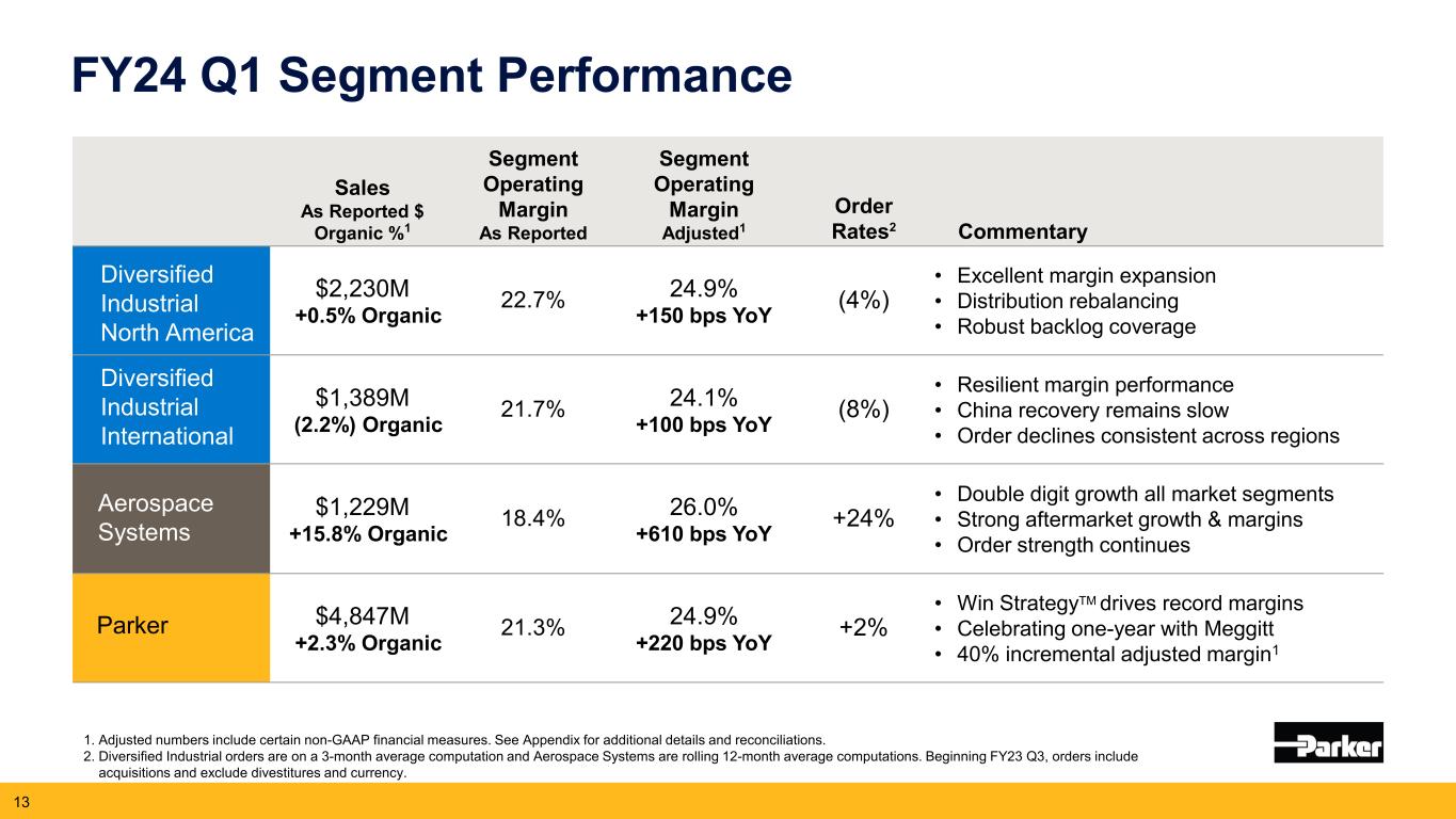 3 FY24 Q1 Highlights $4.8B Reported Sales 15% Increase +2.3% Organic1 24.9% Adjusted Segment Margin1 +220bps 26% Adjusted EPS Growth1 11.4% Free Cash Flow Margin1 Driven by a strong portfolio and our teams executing The Win StrategyTM Record sales, adjusted segment operating margins and adjusted earnings per share All segments above 24% adjusted segment margins1 Parker and Meggitt combination delivered an outstanding quarter for Aerospace Strong start to the year, increasing FY24 guidance FY24 Q1: A Standout Quarter 16% Reduction in Recordable Incidents 1. Adjusted numbers include certain non-GAAP financial measures. See Appendix for additional details and reconciliations. Note: FY24 Q1 As Reported: Segment Operating Margin of 21.3%, EPS of $4.99.